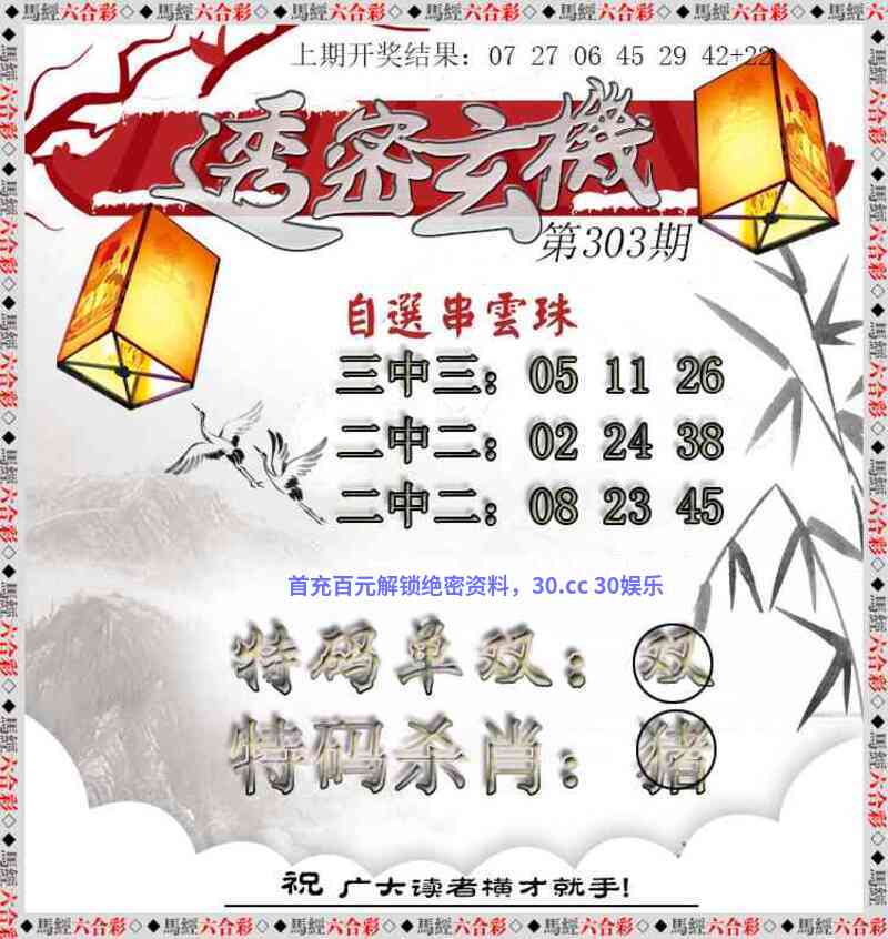 | 303期:七肖 | 兔蛇猴马鸡龙猪 | 開:兔15 |
