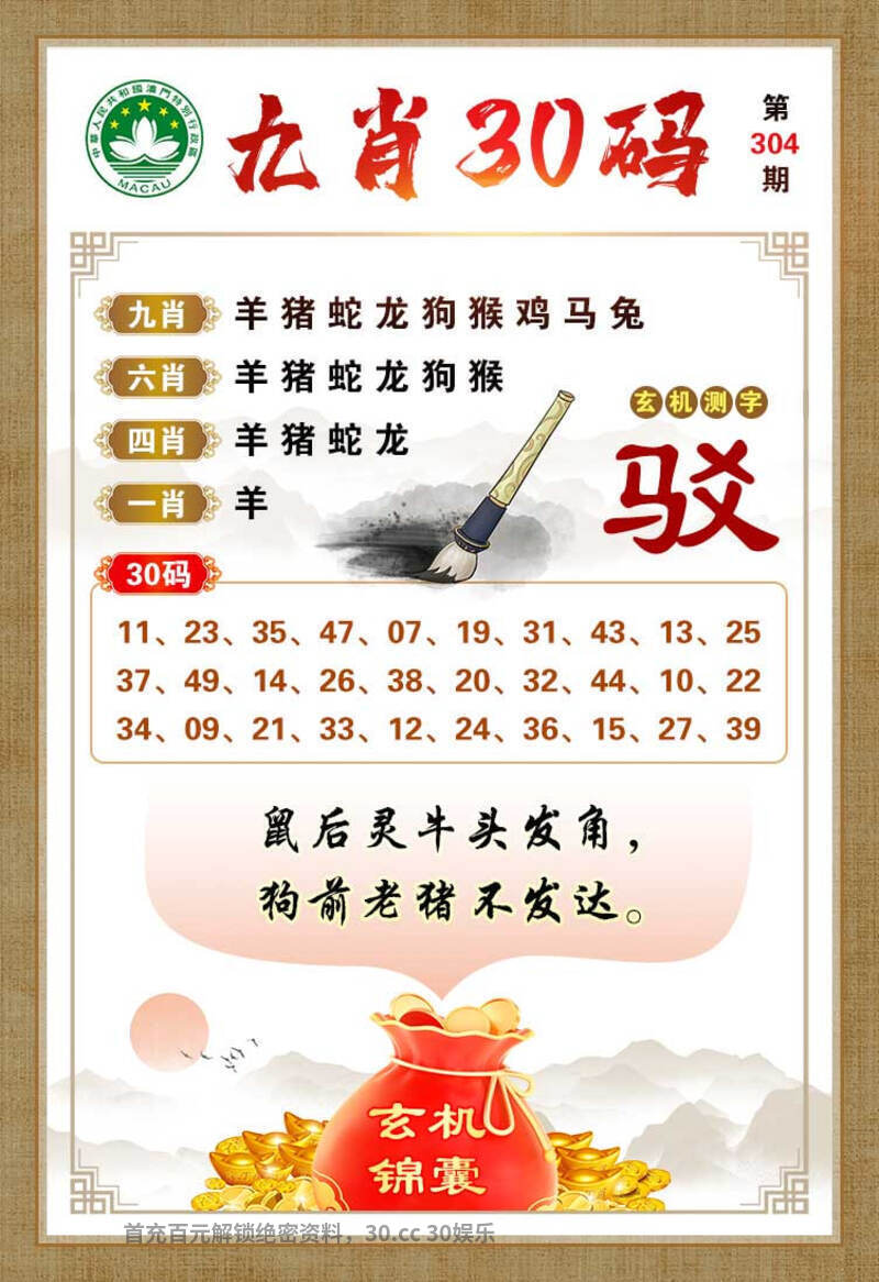 | 304期:九肖 | 蛇鸡羊猴兔牛狗虎马 | 開:马48 |